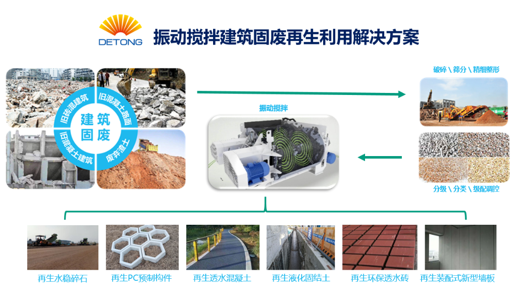 通過強化再生集料微觀均勻性,彌補再生骨料自身性能缺陷,降低再生制品質(zhì)量離差系數(shù),顯著提升再生制品質(zhì)量,形成“建筑垃圾—再生骨料—振動攪拌—再生優(yōu)質(zhì)產(chǎn)品”完整產(chǎn)業(yè)鏈。