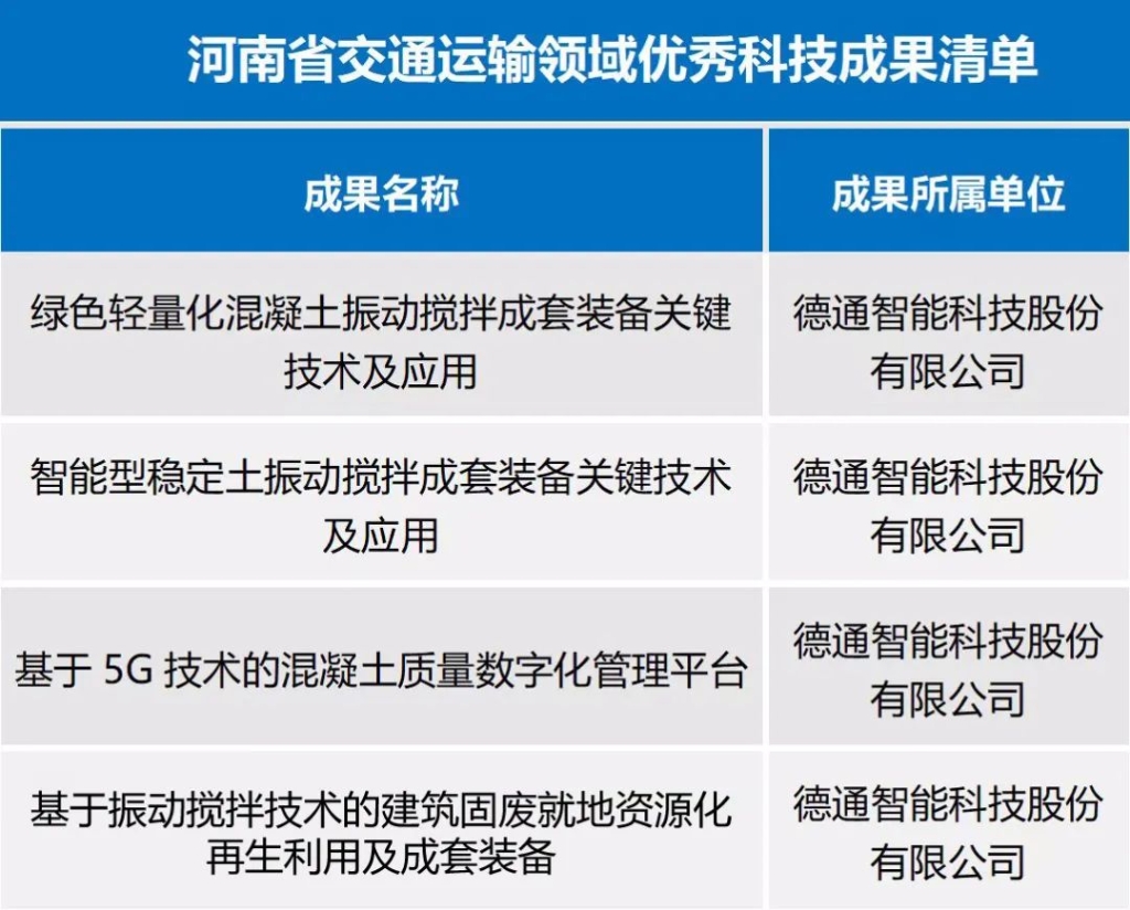 大會上發(fā)布了三十七項(xiàng)河南交通運(yùn)輸領(lǐng)域優(yōu)秀科技成果清單,德通智能科技股份有限公司的《綠色輕量化混凝土振動攪拌成套裝備關(guān)鍵技術(shù)及應(yīng)用》、《智能型穩(wěn)定土振動攪拌成套裝備關(guān)鍵技術(shù)及應(yīng)用》、《基于5G 技術(shù)的混凝土質(zhì)量數(shù)字化管理平臺》、《基于振動攪拌技術(shù)的建筑固廢就地資源化再生利用及成套裝備》4項(xiàng)技術(shù)成果列入河南省交通運(yùn)輸領(lǐng)域優(yōu)秀科技成果清單。